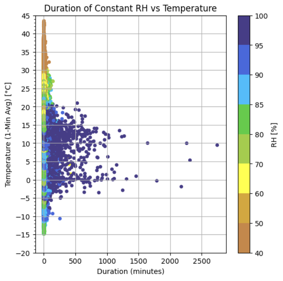 Figure 3. Duration of constant relative humidity (in minutes) versus median temperature for the period of constancy. The scatter points are coloured based on the median relative humidity observed during the same constancy period.