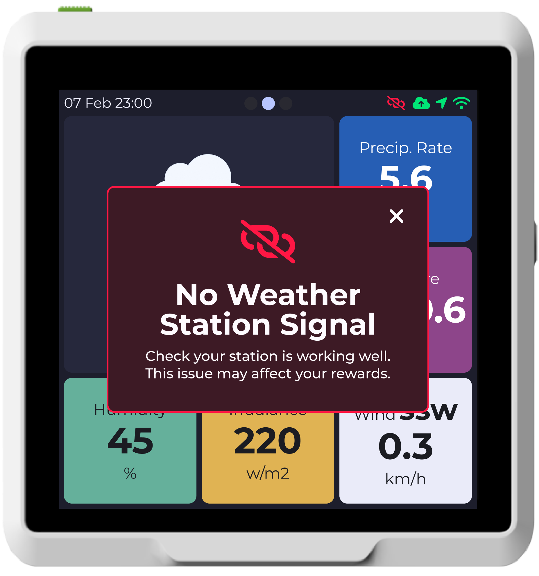 When the RF connection with the Weather Station is weak, the WG1200 Gateway will display "Station Signal is Low" resulting to Data Gaps and reduced Rewards.